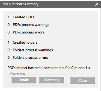 - When the import procedure finishes, the PDFs Import Summary dialog box displays the number of PDF maps and folders.