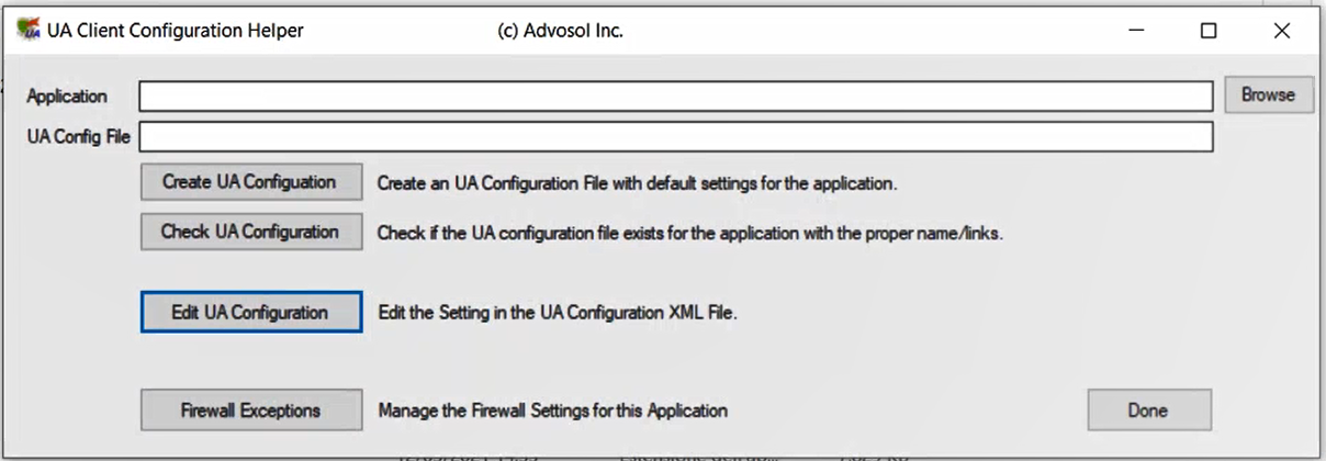 - The path of selected application displays in the Application field. The path of the relevant XML configuration file displays in the UA Config File field.