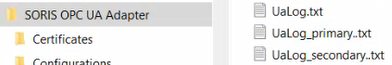 - In C:\Program Files (x86)\Siemens\SORIS OPC UA Adapter, check the content of the relevant TXT file (for example, [UaLog].txt or UaLog_[adapter service name].txt).