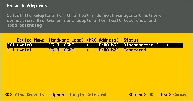 - Using the up/down keys, select Configure Management Network and press ENTER, then select Network Adapters and press ENTER.
