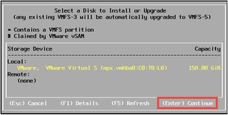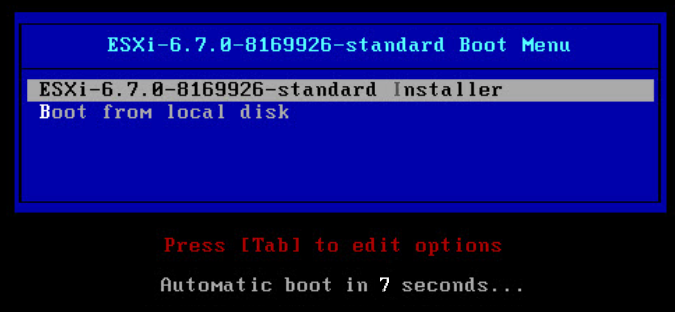 - Select the ESXi ISO disk image, for example ESXi-6.7.0-<nnnnnn>-standard Installer, and press ENTER.