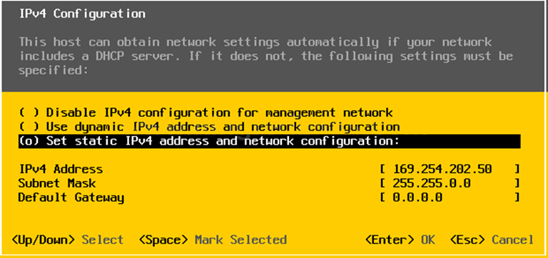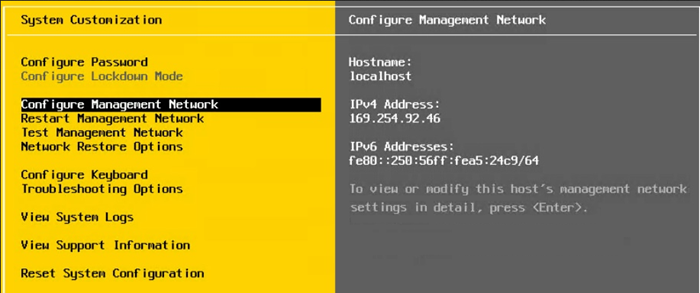 NOTE: Press D to view the network adapter details and then ENTER to go back. - Back in Configure Management Network, select IPv4 Configuration and press ENTER.
