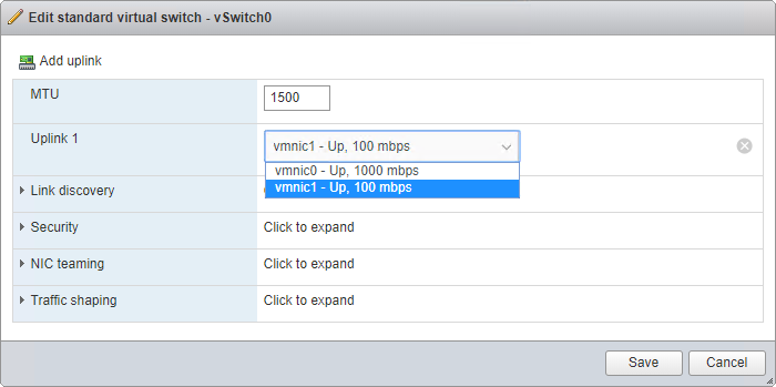 - In Uplink1, select the Network Interface Controller (NIC) for the VM and click Save.