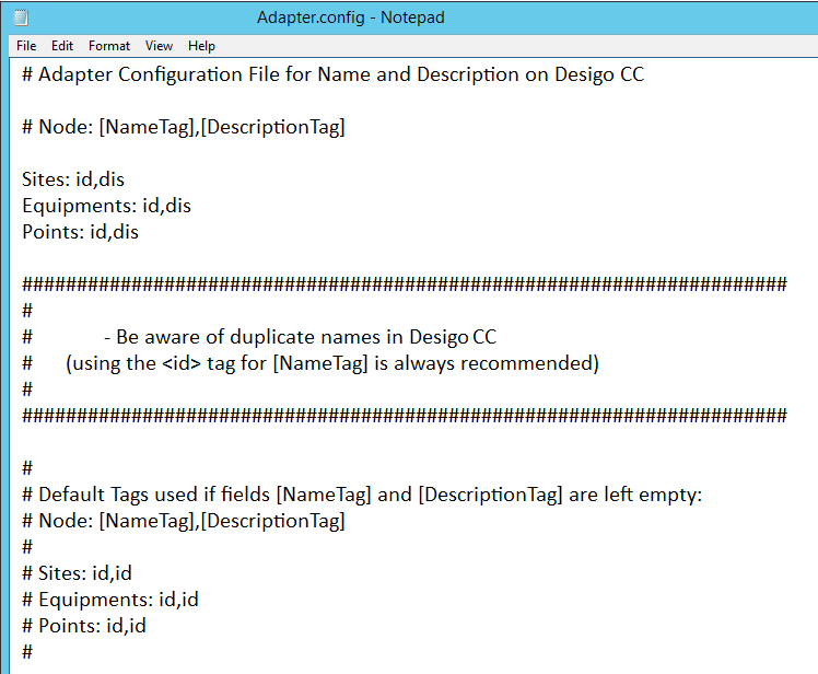 In the Notepad window, configure the Adapter.config file by specifying the default Haystack tags to use for Site, Equipment, and Point entities when imported in the Desigo CC Name and Description in System Browser. Any missing tag will be replaced by the id identifier (default tag): Sites: <Haystack Tag for Name>, <Haystack Tag for Description> Equipments: <Haystack Tag for Name>, <Haystack Tag for Description> Points: <Haystack Tag for Name>, <Haystack Tag for Description> NOTE: Using id for the name is always recommended.