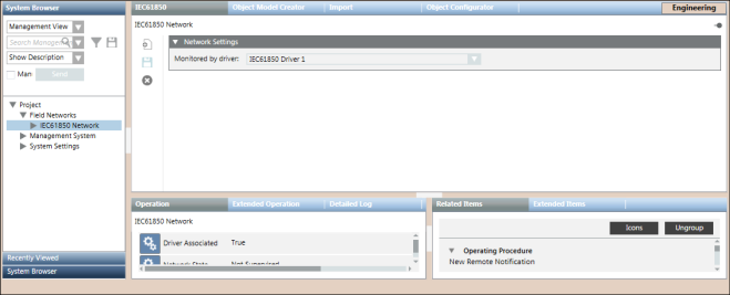 The IEC61850 Network workspace allows you to configure the network settings such as associating the IEC61850 driver to the network, saving the association, and deleting the network. The properties associated with the selected network display in the Operation or Extended Operation tab. You can also change the value of the poll interval. By default, this value is set to 0 ms.