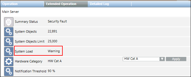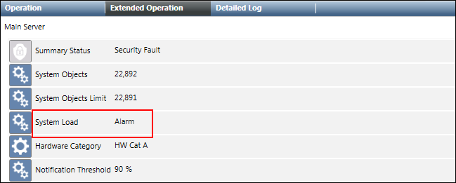 - If the number of IEC61850 objects is between the system limits (defined by the System Objects Limit property) and the safety threshold (defined by the Notification Threshold property), then the System Load property indicates Warning and displays in the Extended Operation tab.