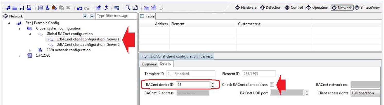 - Under Global BACnet configuration, create the BACnet client that will enable Desigo CC in the Details tab of the BACnet client configuration, choose the BACnet device ID to specify in the driver. Do not enable Check BACnet client address.