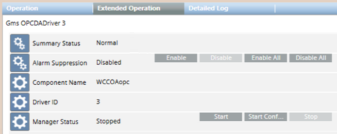 . To be able to connect to the field the driver must be started with either Start or Start Conf… - Select Project > Management System > Servers > Main Server > Drivers > [OPC driver].
