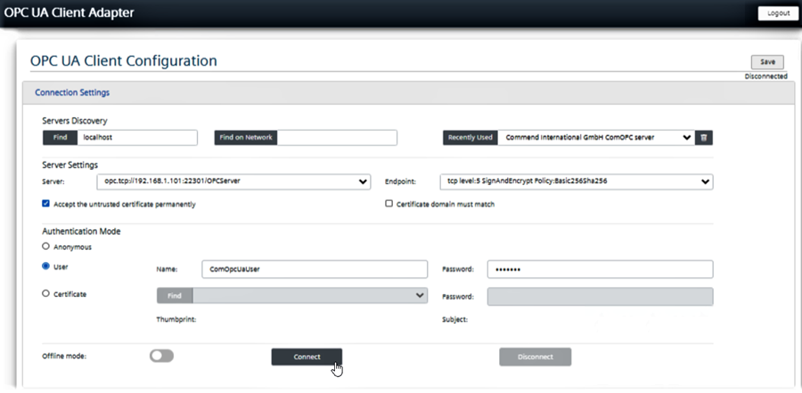 NOTE: For more detailed instructions, see "Performing OPC UA Client Adapter Online Configuration".