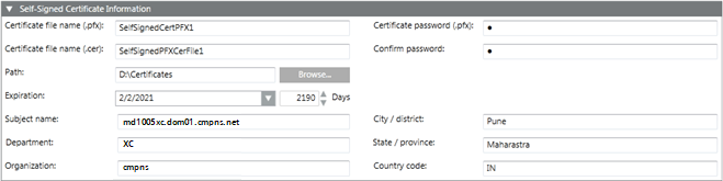In the Self-Signed Certificate Information expander, enter the following details: a. Certificate file name (.pfx). b. Certificate file name (.cer). c. Certificate password (.pfx). d. Click Confirm. e. Browse for the location to store the self-signed certificate on the disk. f. Set the expiration (validity period) duration in days. By default, the certificate expires after 2190 days. g. Enter the following information about the Subject: — Subject name (default) the Full computer name of the host machine, for example, ABCXY022PC.dom01.company.net. However, you should change this to the full computer name of the host machine, where this self-signed certificate will be imported or used. For example, you can change the default subject name to the full computer name of the host machine where the Web application will be hosted. NOTE 1: The self-signed certificate is used as the default certificate while creating a Website/application. To create a Website, the certificate that you enter must be the full computer name. NOTE 2: It is recommended to create only one self-signed certificate with the full computer name. If you create multiple self-signed certificates with the subject name as the full computer name, the Issued to and the Issued by fields of all these multiple certificates will be same and it will be difficult to identify which certificate to use. However, you can identify the certificate using the Thumbprint field of the Details tab, when you view the certificate details. — Department — Organization — City/District — State/Province — Country Code (only two characters). NOTE 3: It is recommended to create a new certificate if the machine name is changed, each machine name must have a unique certificate, you can import and set the certificates as default.