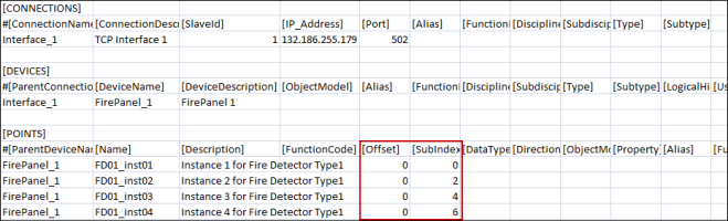 Fire Detector instance | Property | Offset in Object Model | Offset in CSV | Final Offset | SubIndex in Object Model | SubIndex in CSV | Final SubIndex |