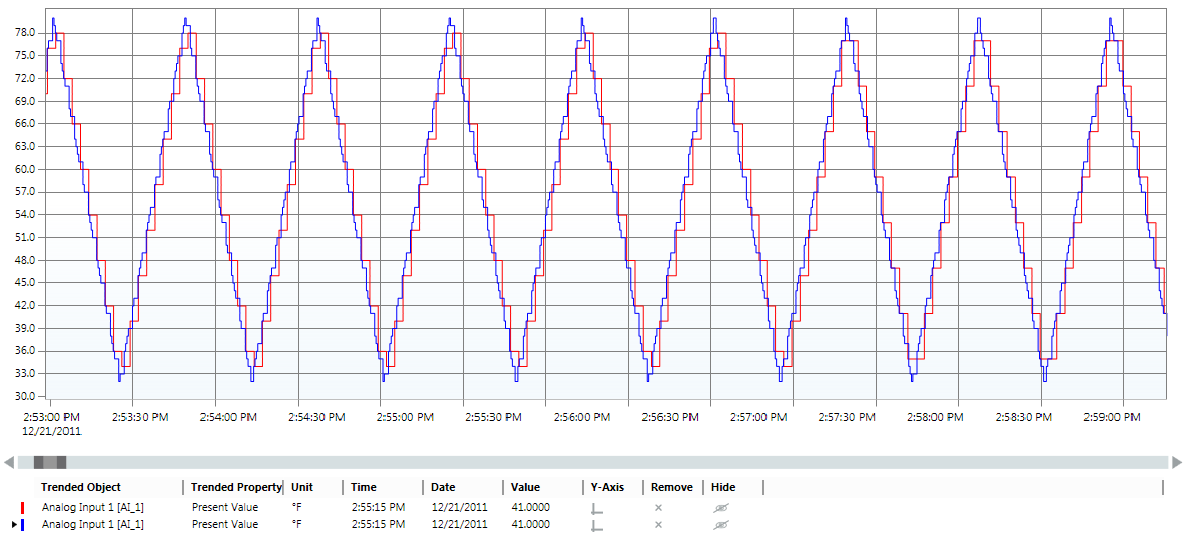 The offline trend data from the trend log objects or trend log multiple objects is uploaded to the management station. The red curve indicates the updated Offline Trend data. The blue curve indicates the online trend data.