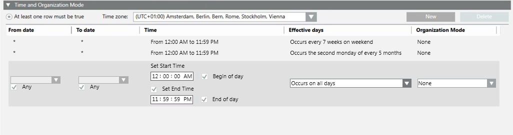 Each condition occupies one row and at least one row must be true (OR logic between rows) to assert the Time and Organization Mode trigger/filter: