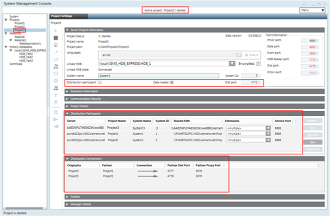 30. Repeat steps 16 to 22 for Project3 on Server3, by adding the partner dist port and partner proxy port for Project1 and by changing the distribution connection such that