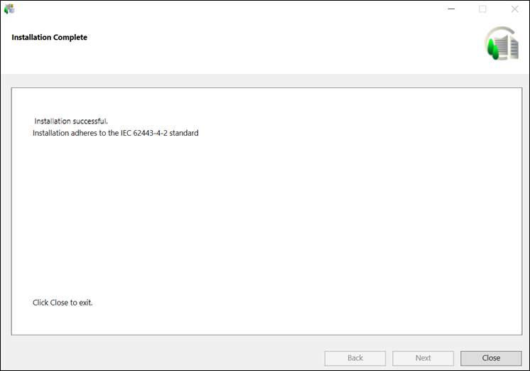 NOTE: In case of any installation errors, such as failure in installing the prerequisite/extension/language pack, click the View Log button to open the log file and view the details of the errors. (See Description of Installer Error Codes) If all the installed extensions are IEC certified, a message "Installation adheres to the IEC 62443-4-2 standard" displays in the Installation Complete dialog box.