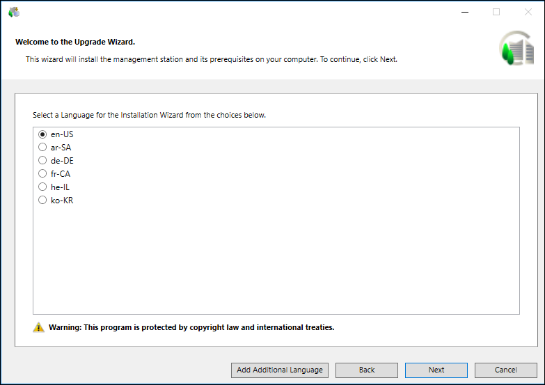 NOTE 2: Regardless of the language selected, the Welcome to the Upgrade Wizard dialog box and all related messages always display in en-US. - Click Next.