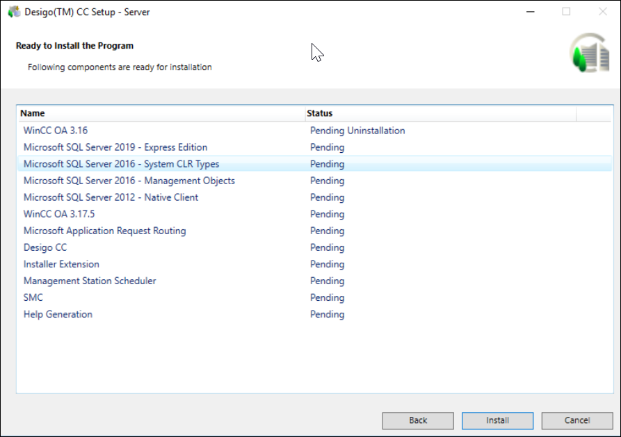 - The Ready to Install the Program dialog box that displays listing the status of the prerequisites, Desigo CC installation (platform + mandatory extensions), platform patch, non-mandatory extensions, mandatory extension patches, non-mandatory extension patches, help merging status, and the status of the post-installation steps selected for execution during the upgrade process.