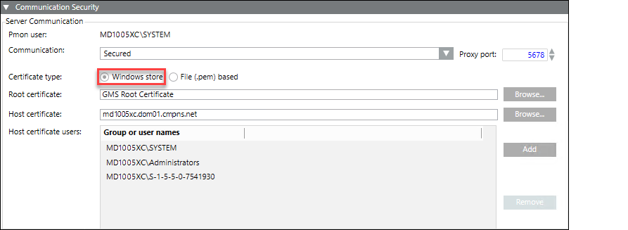 3. To configure the default Certificate type, Windows store, proceed as follows. Otherwise go to step 4 when you change the default Certificate type to configure the file (.pem) based option.