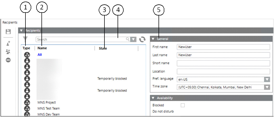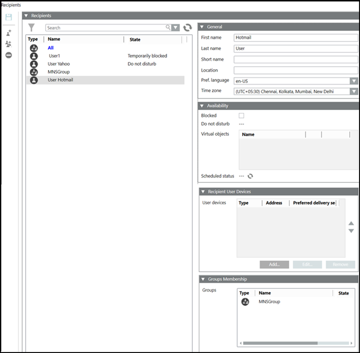 10 | Recipient user devices | Displays the list of user devices for the selected recipient user. Each user device configuration consists of device type, address, and the preferred delivery method. |