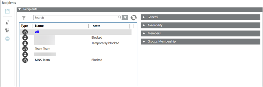 The recipient group details are displayed if a recipient group is selected from the recipients list: