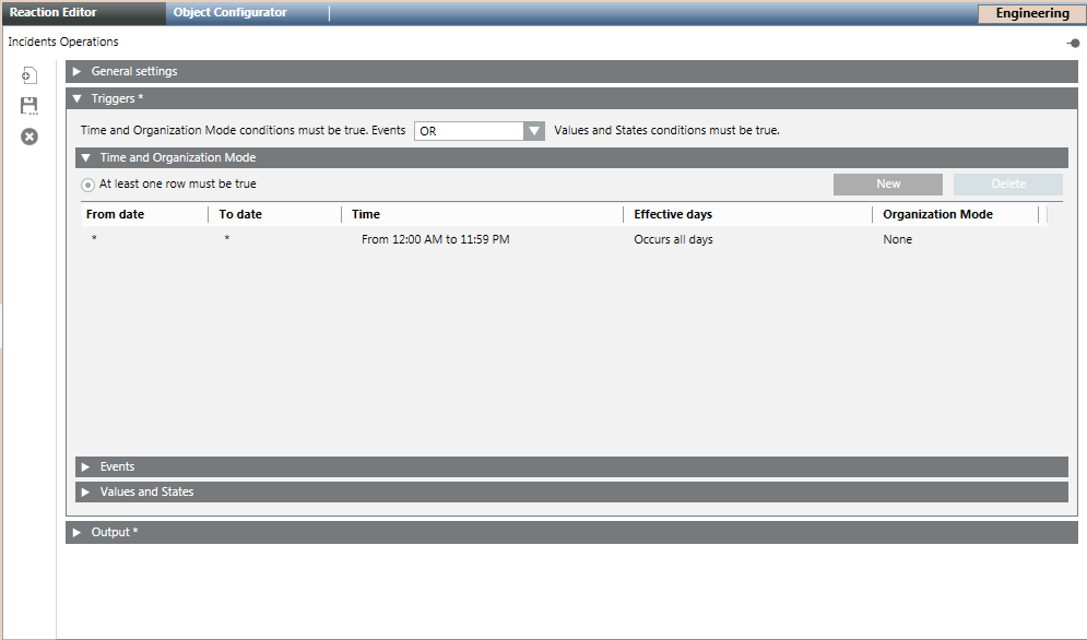- Open the Triggers expander and specify if the conditions specified in both, Events as well as Values and States, expanders must be true or if the conditions specified in either of the expanders must be true by selecting the appropriate operator (AND, OR) in the drop-down list.