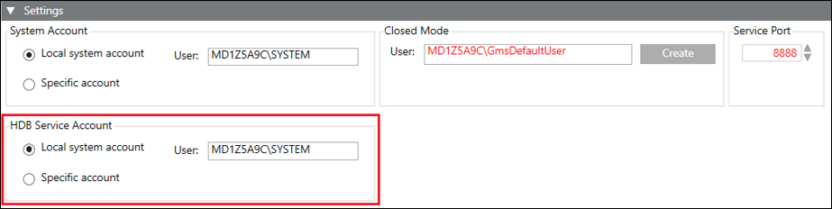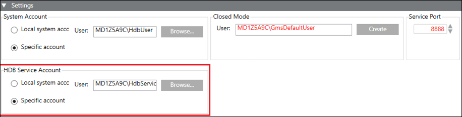 The HDB Service Account Settings allow you to specify the user that internally runs the Siemens GMS HDB Service and is the HDB service user, see Configure the HDB Service Account in System Settings Procedures. Using this user, the HDB is accessed for maintenance operations.
