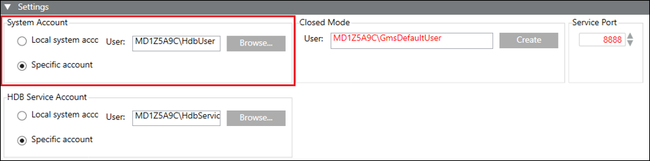 - Specific Account: Using the Specific Account option, you can change the default value (user). If you change the default, you must provide the valid password and confirm it. Changing the default (SYSTEM) internally changes the projects Pmon user and history database’s HDB user. This displays in red when you select the project and HDB. You must edit the project and HDB, which internally syncs the Pmon user and HDB user. The GMS_WCCILpmon_[Project Name] service gets configured in Windows to start under this specific account. The changed user is set as the HDB user.