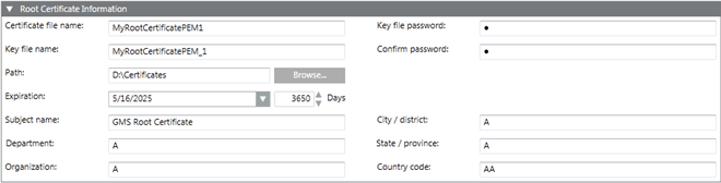 When you click Create Certificate > Create Root Certificate (.pem), the Root Certificate Information expander displays. It allows you to create a .pem root certificate.