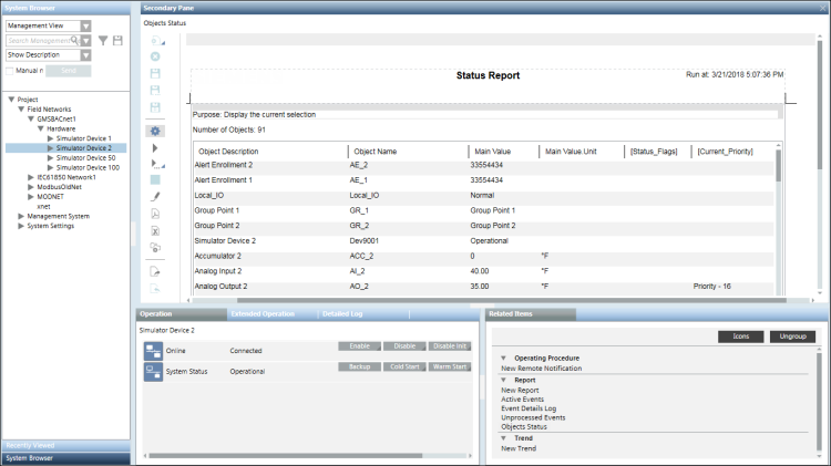 If the selected report in the Related Items tab is a related report for the selected System Browser object, then data is retrieved according to the name filters set for report elements.