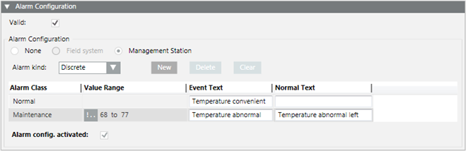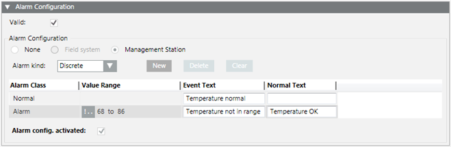 - In the Alarm Configuration expander, the Alarm config. activated check box is selected.