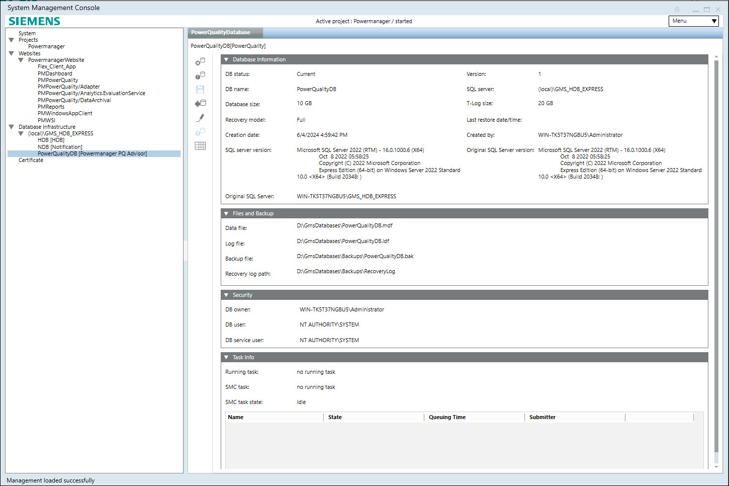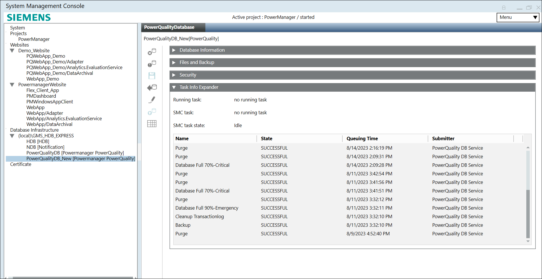 The Task Info expander displays pending tasks or tasks to be executed by the Siemens GMS PowerQuality database Service. It also displays information on the tasks that have been previously executed by the Siemens GMS PowerQuality database Service along with the execution status. This information is online and is not stored.