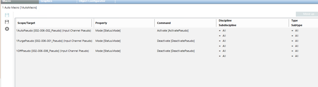 - Drag the following pseudo points to the macro instruction row: AutoPseudo, PurgePseudo, OffPseudo, Fan Spinning and Security (optionally twice).