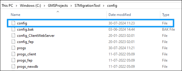 - Open Project config in notepad. This file is present at either of the following locations, \GMSProjects\<ProjectName>\config\config or <ProjectPath>\config\config. For example, in the following image, the config file is located at C:\GMSProjects\S7MigrationTool\Config.