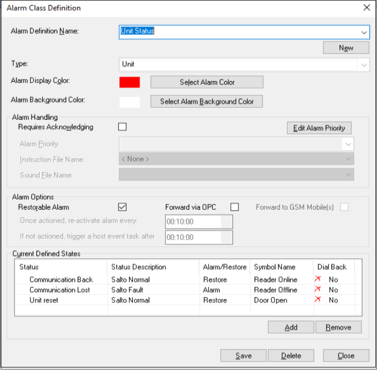 - Assign the Reader Status Alarms alarm class definition (preconfigured in SiPass) to the online wired door object.